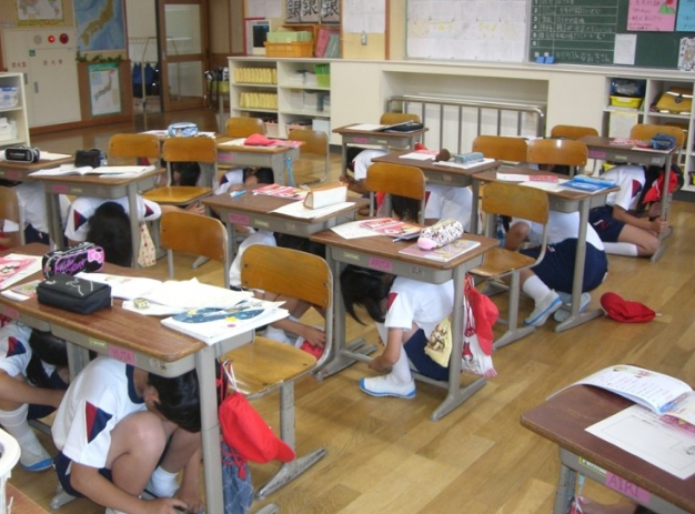 - 실내: 테이블 아래, 가방으로 머리 보호